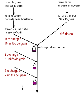 Для второго этапа «Ци минь яо шу» описывает контроль ферментации трёх видов зерна: двух видов проса и клейкого риса[6]. Перед инокуляцией брикеты закваски цюй разламывают и замачивают на 7—10 дней для начала гидролиза. Зерно (просо или рис) тщательно промывают, варят и при необходимости замачивают. Затем проводят серию загрузок зерна на закваску в кувшин-ферментер. Начинается реакция брожения, и через один-два дня всё зерно разжижается. Затем производят вторую загрузку зерна, и цикл повторяется до истощения гидролитической способности фермента. В этот момент сусло ещё содержит много сахара (от гидролиза крахмала), и умелый мастер должен контролировать спиртовое брожение дрожжами, чтобы повысить концентрацию спирта до точки ингибирования дрожжей (около 15 % этанола). Затем вину дают отстояться. Его можно пить как есть или фильтровать. Примечательно, что мастер очень тщательно следит за тем, чтобы температура в бродильном чане не была ни слишком высокой, ни слишком низкой.