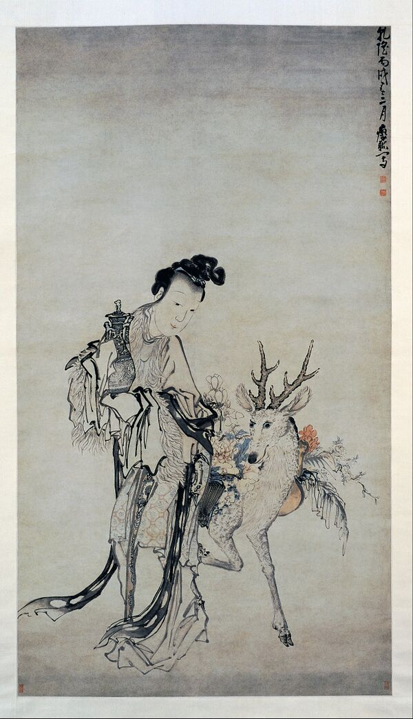 Большой вертикальный свиток Хуан Шэня «Даосские бессмертные, воскуряющие благовония» (бумага, тушь, краски, 1751) экспонируется в Государственном Эрмитаже.