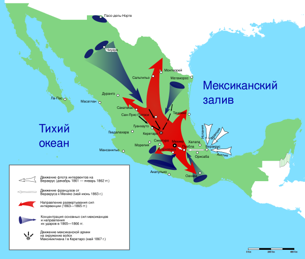 В 1861—1867 годах Хуарес руководил борьбой мексиканского народа против англо-франко-испанской интервенции. В ответ на мирные инициативы мексиканского правительства испанцы и англичане в апреле 1862 года вывели из страны войска, ослабленные эпидемией жёлтой лихорадки. Однако французы под началом Эли Фредерика Форе продолжили вторжение. На первых порах мексиканские войска под командованием Игнасио Сарагосы одержали при Пуэбле существенную победу над французскими интервентами (позднее этот день стал отмечаться как мексиканский национальный праздник — Пятое мая), но те в ответ увеличили численность своего экспедиционного корпуса.