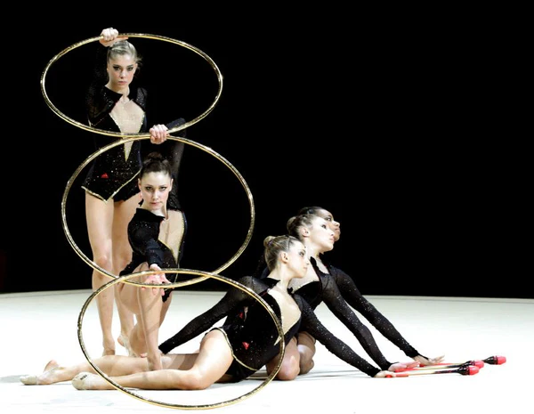 Худо́жественная гимна́стика — вид спорта, заключающийся в выполнении под музыку различных гимнастических и танцевальных упражнений и элементов без предмета, а также с предметом (булавы, мяч, скакалка, обруч, лента). Выступления без предмета не проводятся на соревнованиях мирового класса. В групповых выступлениях используются или один предмет (например, пять мячей, пять пар булав, пять обручей), или одновременно два вида предметов (например, обручи и булавы, ленты и мячи, скакалки и мячи). Победители определяются в многоборье и в отдельных видах.