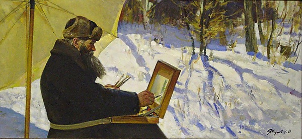 На картине изображён пожилой бородатый мужчина, сидящий в профиль вправо. Он одет в шапку-ушанку и тулуп, на коленях у него находится этюдник, что указывает на занятие живописью на пленэре. За спиной слева виден зонт. Фоном служит зимний пейзаж: на втором плане расположены деревья с синими тенями, а вдали просматривается тёмный лес. Работа выполнена в жанре портрет.