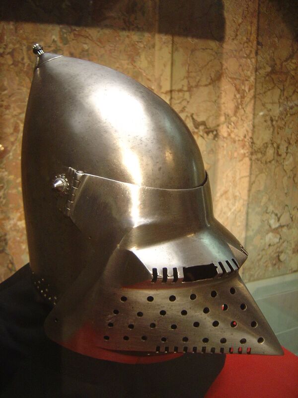 Такая форма забрала увеличивала площадь его поверхности, что позволяло снабдить его множеством вентиляционных отверстий. Это значительно облегчало дыхание воина. Такие отверстия часто располагались лишь на правой стороне шлема, поскольку в конном бою на копьях подвергалась опасности в первую очередь левая половина головы. Коническая форма и гладкость левой части забрала помогала наконечнику вражеского копья соскользнуть даже при мощном ударе. Шлем применялся европейским рыцарством в XIV—XV веках.