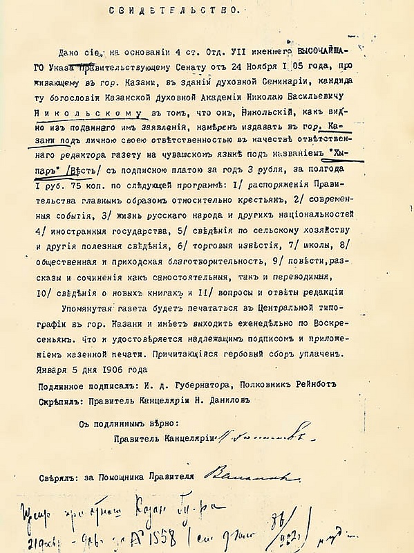 С 1 мая 1917 в Казани под названием «Хыпар» газета на чувашском языке издавалась Чувашской секцией Союза мелких народностей Поволжья; с 10 августа 1917 издавалась Чувашским национальным обществом (ЧНО). Редакторы: А. П. Милли (Прокопьев), Н. П. Петров, А. В. Васильев, М. Ф. Филиппов (М. Ф. Спиридонов), И. В. Васильев, Г. Ф. Алюнов.