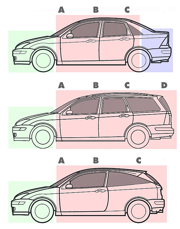 Если задний свес автомобиля имеет такую же длину, как и у седана той же модели, то его тип кузова не может быть назван «хэтчбеком». Например, Audi 100 Avant (на илл. ниже слева) — не хэтчбек, а скорее универсал (или лифтбек, см. ниже), так как имеет одинаковую с базовым седаном длину заднего свеса, хотя задняя стенка кузова у него покатая, что делает его похожим на хэтчбек — на самом деле это единственное, что их объединяет.