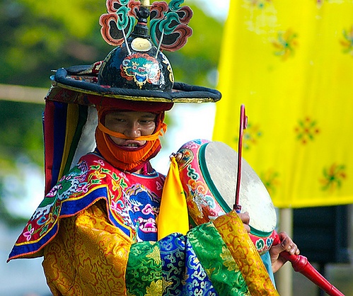 - Дуйнхор-цам или цам Калачакры изображает ожившую мандалу. Танцоры перемещаются по кругу в разноцветных одеяниях и поют мантры.