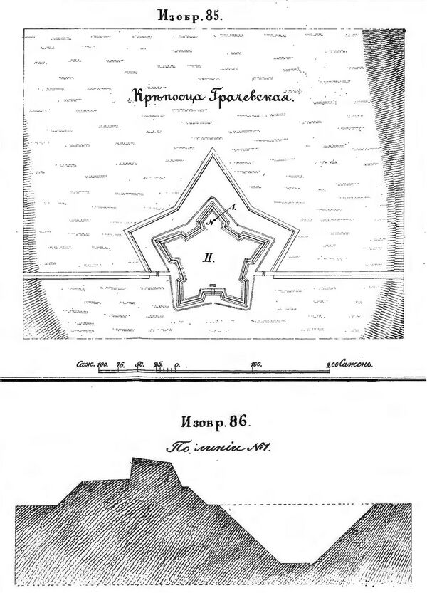 Грачевская[4] — у современного хутора Грачи 48°57′06″ с. ш. 44°17′51″ в. д.GЯO. Форма пятилучевой звезды с ретраншементом, гарнизон 500 человек при 13 пушках.