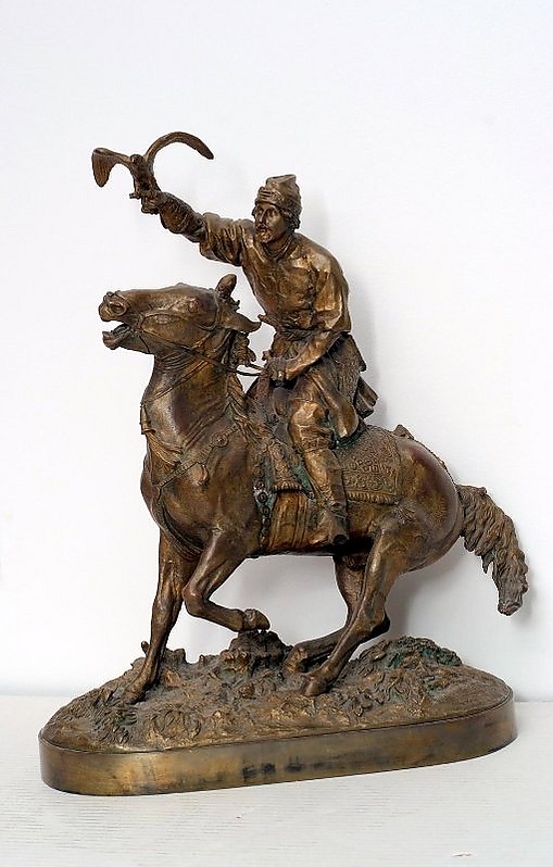 Скульптура представляет собой фигуру сокольничего верхом на лошади. Он изображён в костюме XV–XVI веков: кафтан, шапка и сапоги. На правой руке у него перчатка, которая используется при работе с соколом. Сама птица изображена с раскрытыми крыльями. К поясу мужчины с правой стороны прикреплён колчан со стрелами. Лошадь накрыта попоной и украшена богатой упряжью. Произведение установлено на овальной подставке. Размер скульптуры составляет 45 х 50 х 25 см.