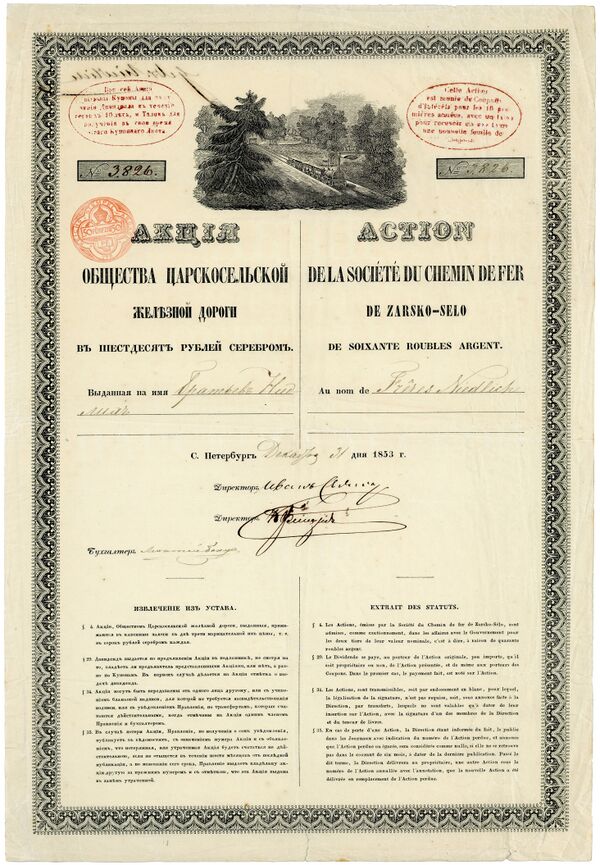 Строительство железной дороги от Петербурга до Царского Села финансировала частная акционерная компания, почти все акции которой (на общую сумму 250 тысяч рублей) приобрёл граф Алексей Бобринский[13]. Благодаря связям жены графа при дворе акционерное общество получило от правительства «исключительное право на постройку дороги с тем, чтобы в продолжение 10 лет по выдаче привилегии никто не имел права строить на означенном расстоянии подобной дороги»[14].