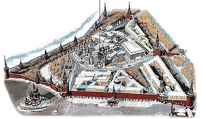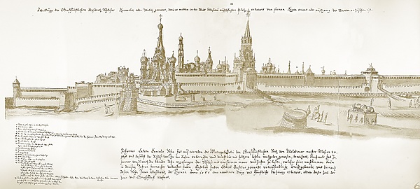 «Вся крепость застроена боярскими дворами, церквами, монастырями, так, что нет ни одной пустыри… Ворот в ней четверо: одни ведут к Москве реке, другие к Ивангороду. Над воротами Фроловскими, на шаре стоит орел, знамение герба Московского. Высокая, толстая стена и глубокий, обделанный с обеих сторон камнем ров отделяют Кремль от Китая-города… Трудно вообразить, …какое бесчисленное множество осадных и других огнестрельных орудий на башнях, на стенах, при воротах и на земле. Там, между прочим, я видел одно орудие, которое заряжается сотнею пуль и столько же дает выстрелов; оно так высоко, что мне будет по плечо; а пули его с гусиные яйца. Стоит против ворот, ведущих к живому мосту. Среди рынка я видел еще мортиру, вылитую кажется только для показа: сев в нее, я на целую пядень не доставал головою до верхней стороны канала. А пахолики наши обыкновенно влезали в это орудие человека по три, и там играли в карты, под запалом, который служил им вместо окна…»[37]