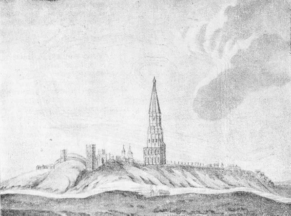 Между городами Можайск и Верея на горе весьма высокой стоит Борис городок, построенный царем Борисом Годуновым, на берегу реки Протвы из белого тесанного камня, стена во многих местах уже упала, как и две башни; в расстоянии саженях ста от оного городка построена башня готической работы прекрасной, которая также требует поправки, а паче, что медью крытая крыша поржавела, и сквозь оную внутри течь. Работа тех древних веков столь хороша, что без сожаления и сломать не можно. Вышина ж оной равенствует Ивану Великому; но та башня многим лучше, и легче и в правилах совершенных готической архитектуры; и весьма малым бы коштом могла быть поновлена. Сей городок и башня окружены селением экономических деревень, но внутри городка нет никакого жилья. И так по не присмотру везде железо в перемычках выломано; но со всем тем трещин капитальных нет
