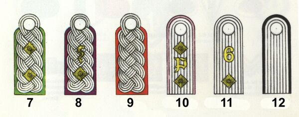 - нашивки на разных элементах мундира (от простых полос или геометрических элементов до основного цвета шеврона рода войск или подразделения);