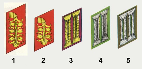 - петлицы. На служебной или парадной форме род войск передавался цветом подкладки петлиц, а на полевой — только цветом просветов в «катушке» на петлице. У генералов петлицы были красные с вышитым золотом растительным орнаментом, у генералов административного аппарата — синие.