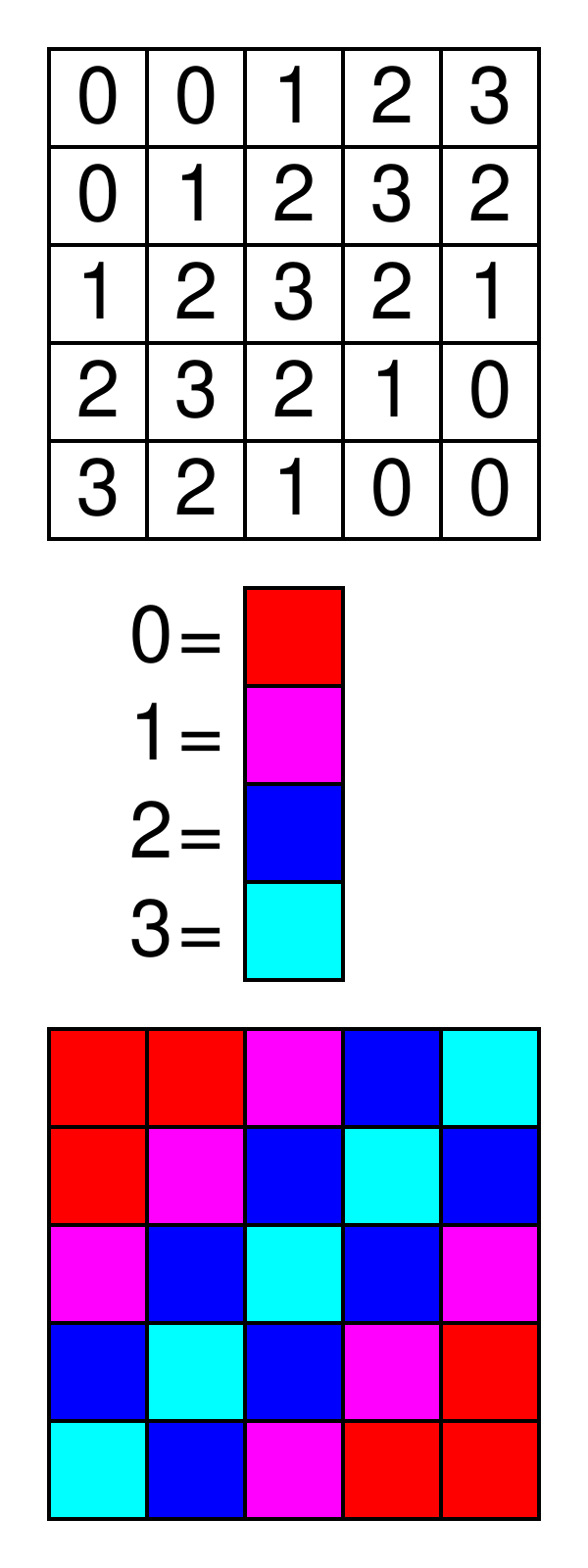 Таким образом, каждый элемент изображения (пиксел) представлен в памяти не реальным цветом, а неким условным индексом, который расшифровывается по таблице цветов (палитре) в реальные компоненты цвета, что позволяет для каждого такого элемента построить «истинный» цвет в заданной цветовой модели.
