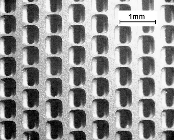 - Отверстия в маске имеют форму прямоугольников со скруглёнными углами и располагаются в шахматном порядке для большей прочности и стабильности формы маски;