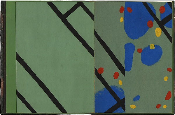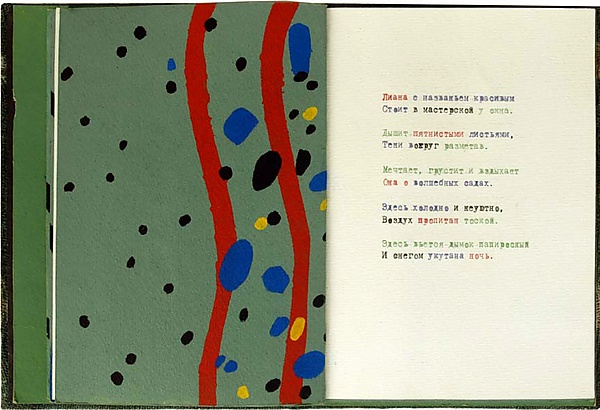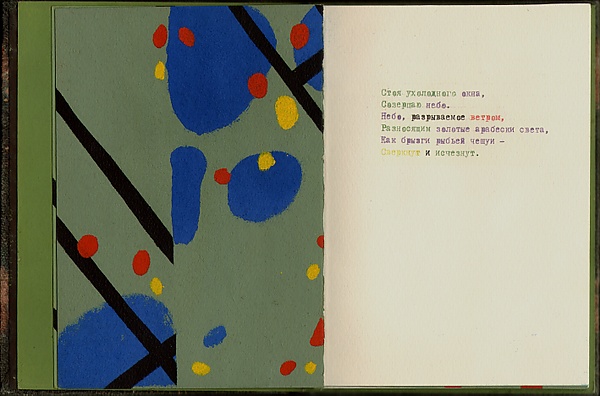 Оригинальный текст (англ.)[показатьскрыть]A sheet of graphic ‘sounds’ alternates with a poem printed on recto (the sheets’ versos remain blank). The visual elements work as an independent ‘text’ that prompts certain analogies between colour and sound, with which the early twentieth-century avant-garde also experimented, not only in painting, but also in music. Thus, colour is not only a decorative element but it also provides the main ‘sound’ of the book and adds different layers of meaning.