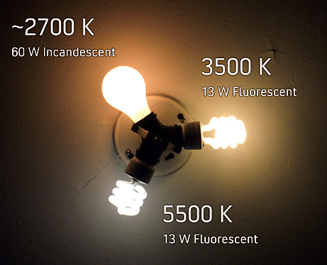 - 3000 К — лампа накаливания 200 Вт, галогенная лампа, люминесцентная лампа тёплого белого света;