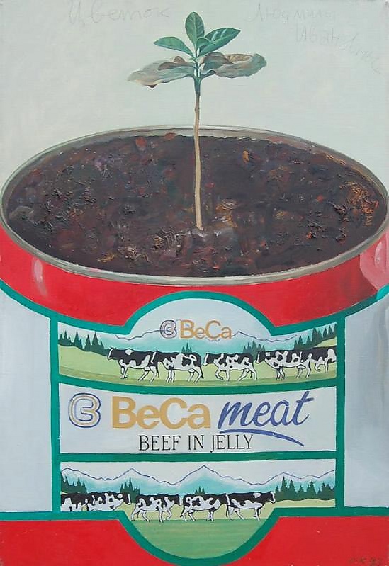 На полотне крупным планом изображён высокий тонкий комнатное растение с листьями, расположенными в верхней части стебля. Растение помещено в яркую жестяную консервную банку из-под говяжьей тушёнки. Композиционное решение подчёркнуто тем, что боковые стороны и основание банки обрезаны краями картины, что усиливает эффект приближённого взгляда на предметы.