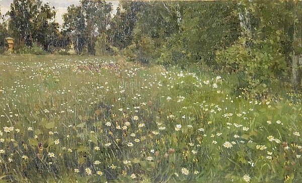 На полотне представлен пейзаж, в центре которого находится просторный луг с высокой травой, белыми цветами ромашки и лиловыми кашками. Справа изображена опушка парка. В глубине композиции видны ряды берёз, сквозь которые открывается вид на луг заднего плана и часть строения, почти полностью скрытого деревьями. В просветах между берёзами заметно облачное небо, придающее работе ощущение воздушности и глубины.