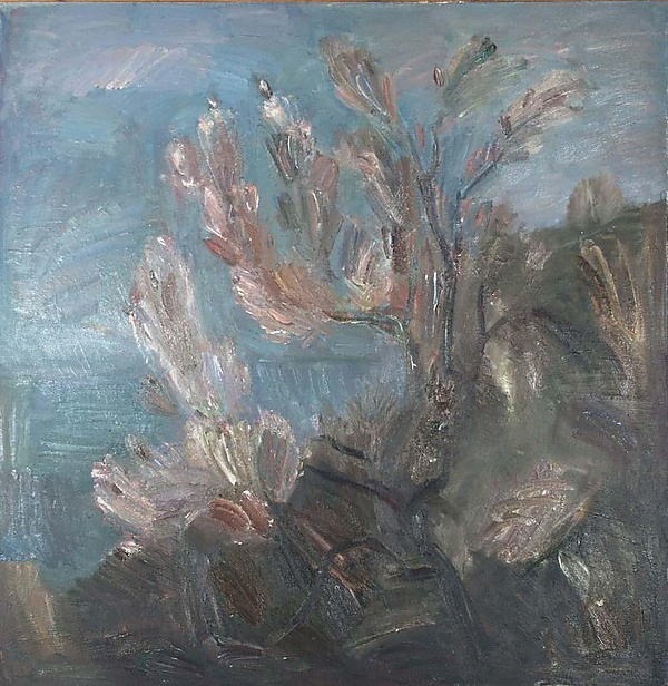 На переднем плане изображено крупное цветущее дерево миндаля с чёрным изогнутым стволом, окружённое зарослями. Фоном служит небо над морем. Композиция построена с использованием широких, свободных пастозных мазков. В цветовой гамме преобладают голубые, розовые, изумрудные, сиреневые, лиловые, болотные и пепельно-серые тона, тонко проработанные по оттенкам.