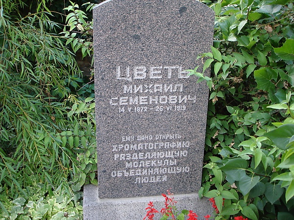 Михаил Семёнович Цвет (14 мая 1872, Асти, Пьемонт — 26 июня 1919, Воронеж) — русский ботаник-физиолог и биохимик растений. Создал хроматографический метод. Исследовал пигменты листьев растений, получил в чистом виде хлорофиллы a, b и c и ряд изомеров ксантофилла. Открытие Цвета получило широкое применение и признание с начала 1930-х годов при разделении и идентификации различных пигментов, витаминов, ферментов, гормонов и других органических и неорганических соединений и послужило основой для создания ряда новых направлений аналитической химии (газовая хроматография, жидкостная хроматография, тонкослойная хроматография). Для физиологии растений существенны выводы М. С. Цвета о природе хлоропластов, состоянии хлорофилла в растении, механизме фотосинтеза и другие.