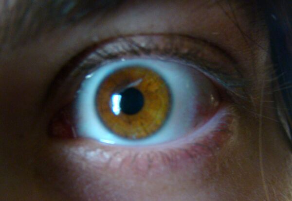 Жёлтые глаза имеют монотонную светлую жёлто-коричневую окраску. Иногда они характеризуются золотисто-зелёным либо красновато-медным оттенком. Это обусловливает пигмент липофусцин (липохром), содержащийся также в зелёных глазах[31][32]. Жёлтый цвет глаз встречается крайне редко. Это случается только тогда, когда сосуды радужной оболочки содержат пигмент липофусцин (липохром) очень бледного цвета[33].