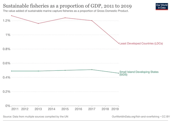 - показатель 14.7.1: «Экологически рациональный рыбный промысел в процентах от ВВП в малых островных развивающихся государствах, в наименее развитых странах и во всех странах»[17].