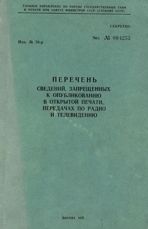В 1925 году под грифом «Совершенно секретно» Главлит выпустил первый «Перечень сведений, составляющих тайну и не подлежащих распространению в целях охранения политико-экономических интересов СССР». Текст первого списка имел 16 страниц и содержал 96 пунктов[53]. Кроме перечня выпускались циркуляры с указанием запрещённых тем. Их число быстро росло. В документе, с которым работали цензоры в последние годы существования СССР, насчитывалось 213 параграфов, и в каждом — по 5, 6, а то и 12 пунктов[54].