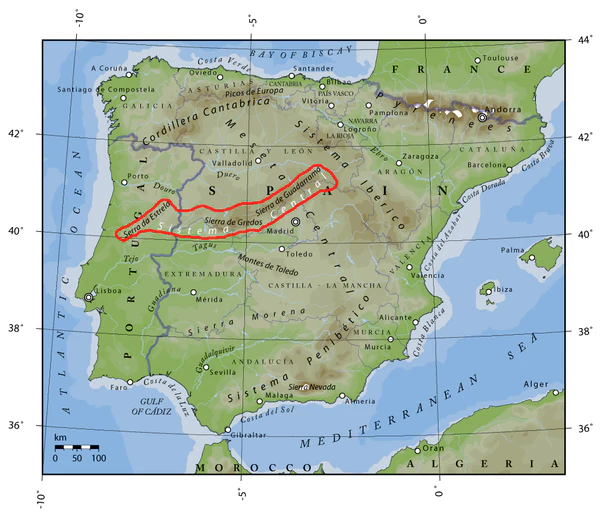 Разделяет Кастильское плоскогорье на две части — Южную и Северную Месеты.