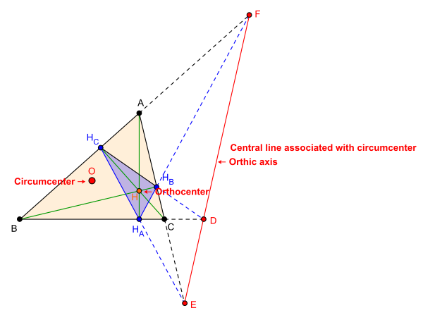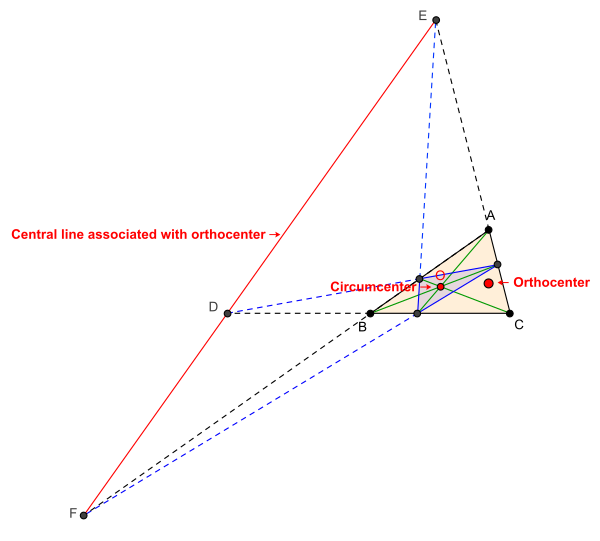 Трилинейные координаты ортоцентра X4 (также обозначается как H) треугольника ABC есть(sec A : sec B : sec C). Таким образом, центральная прямая, связанная с центром описанной окружности в трилинейных координатах задаётся уравнением