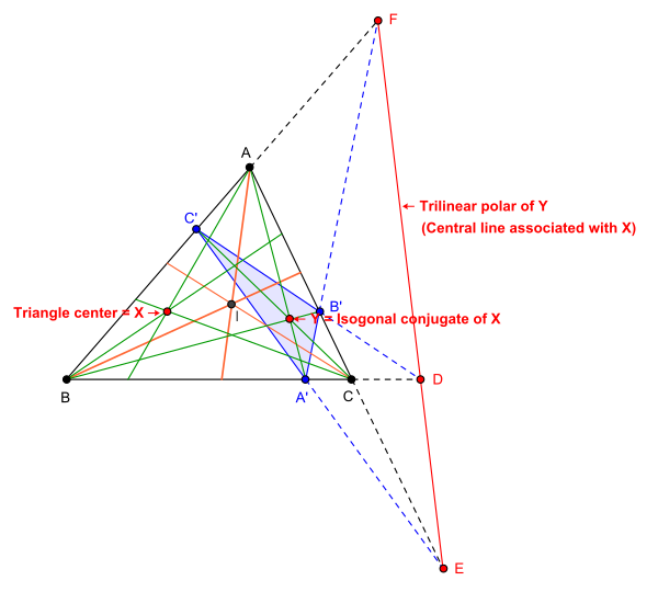 Геометрически связь между центральной прямой и связанным с ней центром может быть выражена с использованием термина трилинейной поляры и изогонального сопряжения. Пусть X = (u (a, b, c) : v (a, b, c) : w (a, b, c)) — центр треугольника. Тогда уравнение трилинейной поляры треугольного центра X есть[2][5]