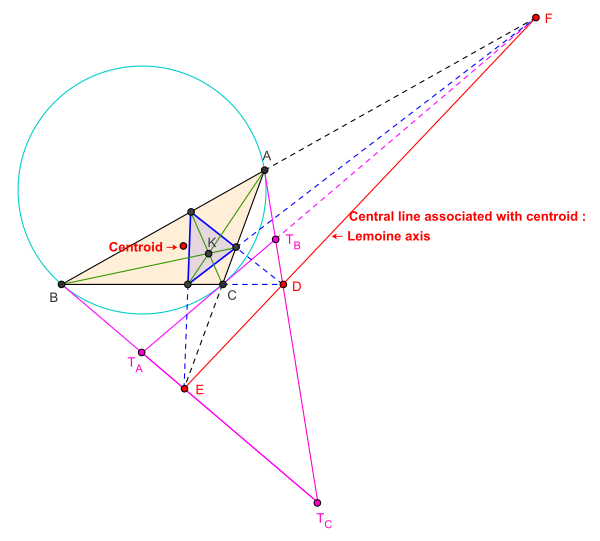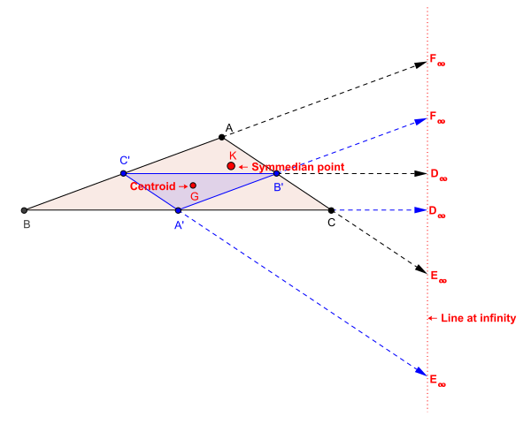 - Изогональное сопряжённой к точке пересечения симедиан треугольника ABC является центроидом треугольника ABC. Таким образом, центральная прямая, связанная с точкой пересечения симедиан, является трилинейной полярой центроида. Она является осью перспективности треугольника ABC и его дополнительного треугольника (он же — серединный треугольник = medial triangle).