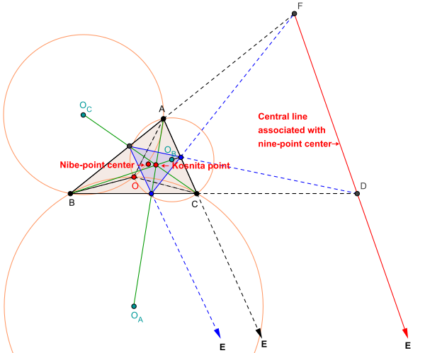 - Изогональное сопряжение центра окружности девяти точек треугольника ABC есть точка Коснита X54 треугольника ABC.[10][11]. Таким образом, центральная прямая, связанная с центром окружности девяти точек является трилинейной полярой для точки Коснита.