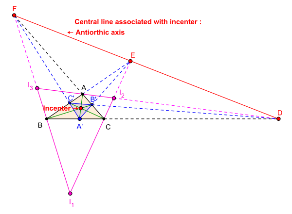 - Изогонально сопряжённый инцентру треугольника ABC центр — это сам инцентр. Таким образом, антиортовая ось, которая является центральной линией, связанной с инцентром, является осью перспективности треугольника ABC и чевианного треугольник инцентра треугольника ABC.
