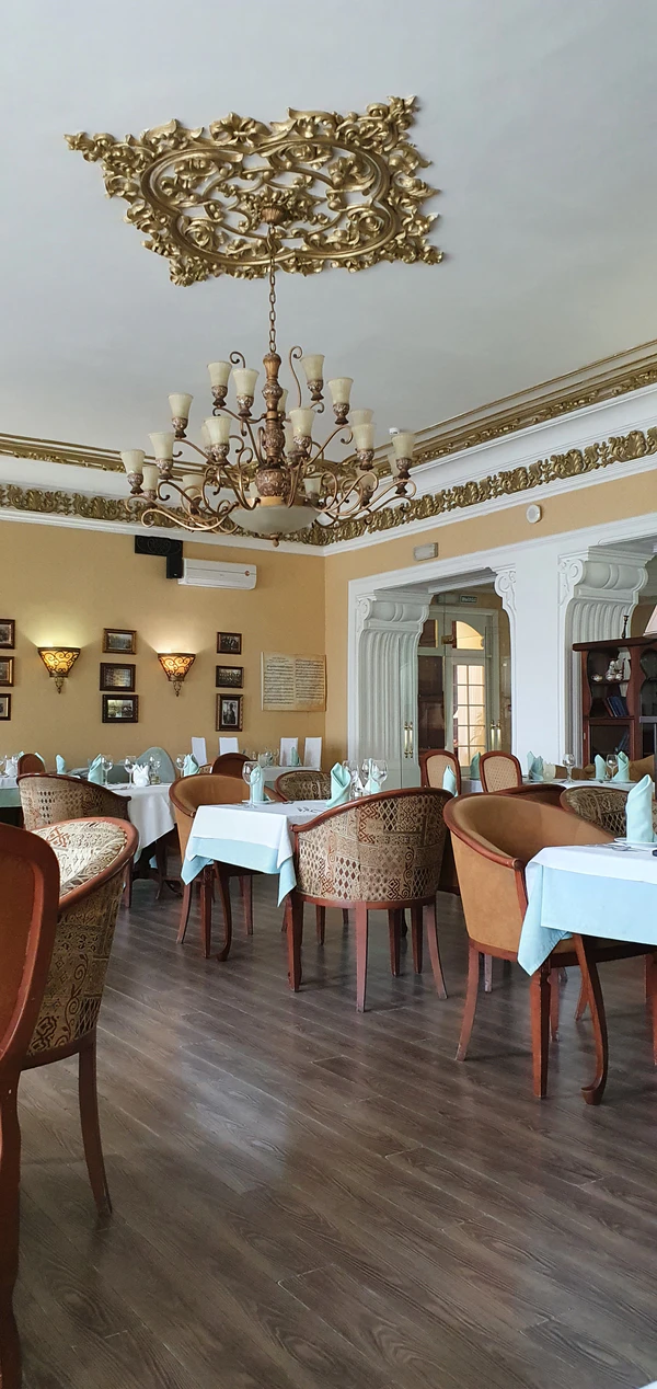 Здание прямоугольное в плане, с обширным подвалом. Первый этаж занимают ресторан, второй и третий — гостиница. В подвале размещён бар.