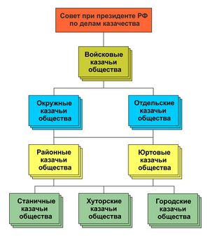 В структуре окружных (отдельских) казачьих обществ состоят районные (юртовые), станичные (городские) и хуторские казачьи общества. Всего около 230 казачьих организаций[7].