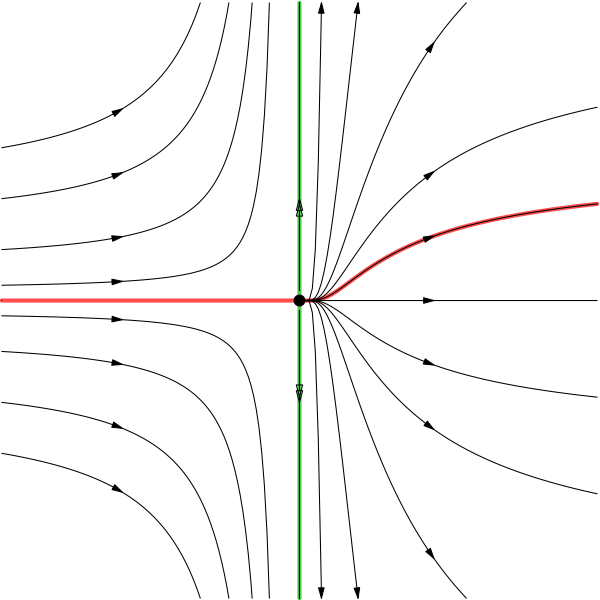 Эти подпространства являются инвариантными многообразиями линеаризованной системы , решением которой является матричная экспонента . Оказывается, динамика системы в окрестности особой точки по своим свойствам близка к динамике линеаризованной системы. Точнее, справедливо следующее утверждение:[3][4]