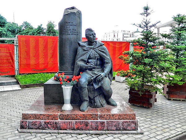 В 1993 году в сквере перед зданием установили памятник фронтовым корреспондентам. На колонне за его спиной высечена цитата из песни «Корреспондентская застольная»: «С „лейкой“ и блокнотом, а то и с пулемётом сквозь огонь и стужу мы прошли». Авторы произведения — скульптор Лев Кербель и архитектор Евгений Розанов[11].