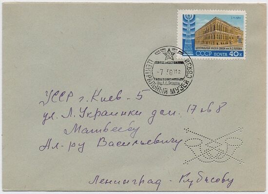 Письмо из Ленинграда в Киев, франкированное почтовой маркой СССР в честь Дня радио (ЦФА [АО «Марка»] #2421; Mi #2343). Текст на почтовом штемпеле: «Центральный музей связи им. А. С. Попова. СССР» (1960)