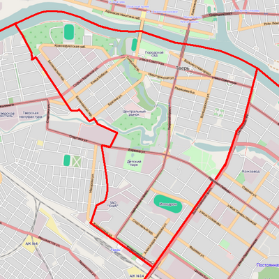 - ↑ Описание границ между районами города содержится в веб-архиве старой версии официального сайта города Твери на странице Устав города. Приложение 1. Границы и состав территорий города Твери. Архивировано из оригинала 8 января 2002 года. — со ссылкой на решения горисполкома от 7 января 1965 года № 9 и от 30 декабря 1975 года № 253 (проверено 30.09.2009) и отображена на некоторых картах и атласах.