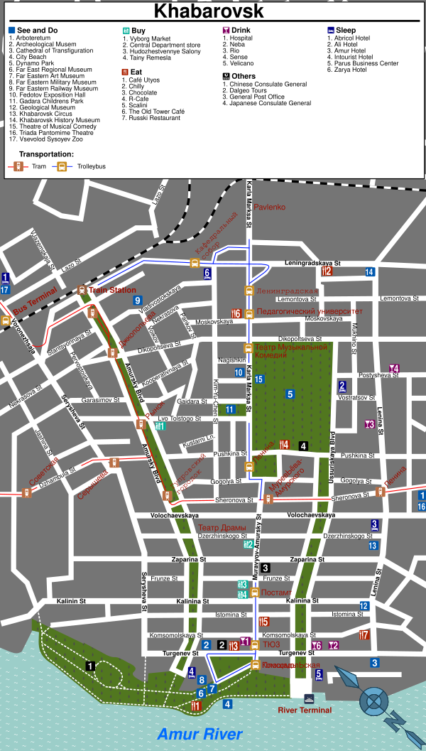 - Муравьёва-Амурского, Ленина, Амурский бульвар, Уссурийский бульвар, Волочаевская, Ленинградская, Тургенева, Калинина, Дзержинского, Пушкина.