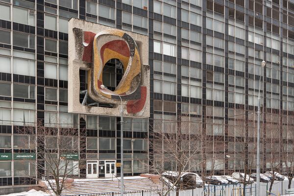 Над входом в институт находится еще одна квадратная пластина со вписанным в нее мозаичным горельефом — это композиция «Лента Мёбиуса», выполненная в 1976 году художниками Э. А. Жареновой и В. К. Васильцовым[2][3]. За характерный внешний вид здание получило известность как «дом с ухом»[4].