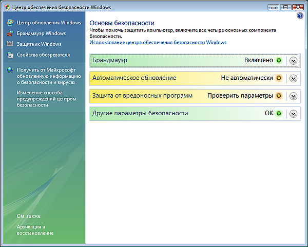 Апплет панели управления группирует контролируемые параметры по категориям и выделяет их цветом. Жёлтый цвет указывает на незначительное предупреждение, например, неполный мониторинг некоторых настроек. Красным цветом выделяются критические сообщения, например, при отключении антивирусного ПО.
