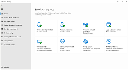 - также отслеживает защиту в реальном времени, драйверы, параметры безопасности устройств, ёмкость хранилища, защиту учётных записей, родительский контроль, SmartScreen и обновления Windows[14]
