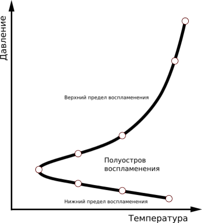 С повышением температуры область воспламенения между нижним и верхним пределами воспламенения расширяется вследствие того, что повышается вероятность энергетического разветвления цепи, в то же время скорость обрыва цепи изменяется слабо. При понижении температуры нижний и верхний пределы воспламенения сливаются в одну точку. В итоге зависимость пределов воспламенения от температуры имеет характерный вид, называемый полуостровом воспламенения.