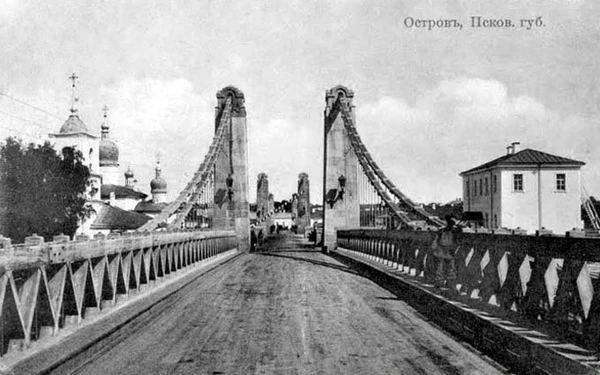 До сооружения постоянных металлических мостов сообщение между берегами реки Великой в Острове осуществлялось паромами, а также по лёгкому временному деревянному мосту на козлах. Этот непрочный мост приходилось ежегодно разбирать, к тому же он часто разрушался паводковыми водами. Необходимость строительства постоянных мостов через реку Великую в городе Острове была вызвана прокладкой через него в 1830-х годах Динабургского шоссе от Санкт-Петербурга до Динабурга. Проекты строительства постоянного моста последовательно предлагались в 1837, 1841, 1846 гг[2]. К осуществлению был принят проект цепного висячего моста, разработанный инженером путей сообщения М. Краснопольским.