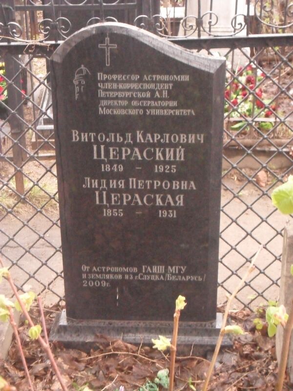 В. К. Цераский — один из пионеров применения фотографии в астрономии, основал московскую школу астрофотометрии. В 1887 году построил фотометр (на основе фотометра Цёлльнера), с которым выполнил ряд исследований — определил звёздные величины и составил каталоги звёзд в околополярной области, в скоплениях h и χ Персея и в Волосах Вероники. В 1903 году оригинальным способом определил видимую звёздную величину Солнца. По его данным, эта величина составляет −26,72 — результат, практически совпадающий с современным[14]. В 1895 году на основе опытов с плавлением металлов в фокусе вогнутого зеркала Цераский впервые установил нижний предел температуры Солнца в 3500 °С[15]. Совместно со своей супругой Лидией организовал в Московской обсерватории систематические поиски и изучение переменных звёзд фотографическим путём, начатые в 1895 году на сконструированном им короткофокусном широкоугольном астрографе.