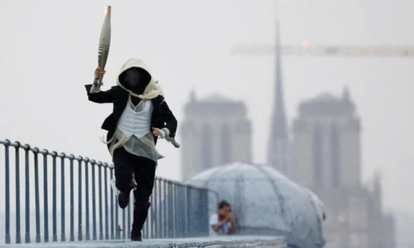 После прохода всех спортивных делегаций всадник «Зорро» сделал из олимпийского флага плащ и на железном коне скакал прямо по Сене, затем появившись на площади Трокадеро.
