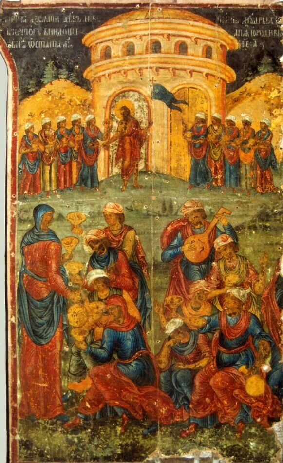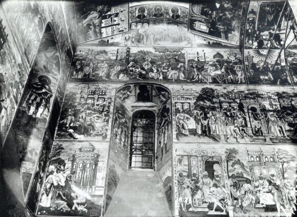 В 1742—1743 годах стены храма был расписаны, о чём на стене была оставлена надпись: «Лета 6250 [1742] от Рождества Христова месяца июня начата бысть сия святая церковь стены подписанием и изображением при державе благочестивейшей, самодержавнейшей великой государыни императрице Елизавете Петровне, при наследнике ее внуке Петра I благочестивом государе и великом князе Петре Федоровиче, при супруге его благоверной государыне великой княгине Екатерине Алексеевне и при благоверном государе великом князе Павле Петровиче, благословением правительствующего Синода, преосвященного Арсения, митрополита Ростовского и Ярославского, при священнике сей святой церкви Федоре Семенове, диаконе Петре Михайлове. Тщанием и подмоганием сей святой церкви приходских людей, их имена в книге. А совершися же 1743 года месяца июля». Сохранились и имена мастеров: «Знамения Алексей Иванов сын Сопляков, и прочие писали: сын его Михаил Алексеев, Андрей Амельянов да дети его Афанасий, Иван Шустовы, Иван да Иван же Никитины дети Горины, Матвей Сергеев сын Дьяконов, Федор Ларионов сын Пототуев, Семен Федоров, сын его Семен же Нерехчаня, Алексей Данилов сын Иконников, Петр Иванов сын Трапезников, Петр Федоров сын Кузнецов»[4].