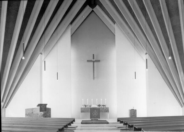 Церковное здание в форме палатки состоит из крутой, покрытой медью крыши в виде ромба над почти квадратным этажом. Фронтонные стены почти полностью снабжены частично окрашенными стеклянными окнами с трех сторон, только северо-восточная сторона, которая образует алтарную стену, является закрытой стеной. Крыша церкви тянется вперед до юго-западного входа. Высокая, отдельно стоящая колокольня имеет подиумообразные концы, она увенчана шаром в виде Земли и крестом.