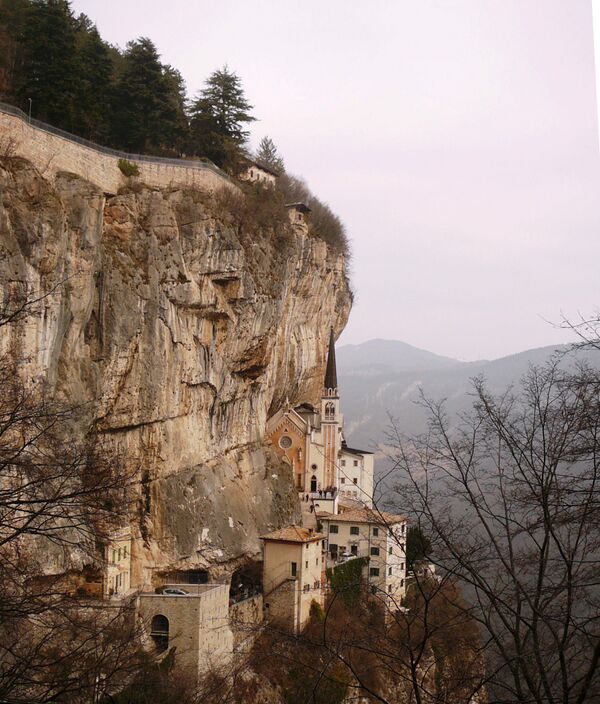 В начале церковь была известна под именем «Санта-Мария-ди-Монтебальдо». В 1898 году было решено расширить строение и вывести его примерно на два метра вперёд, в сторону площади перед церковью. В 1899 году фасад был переделан в готическом стиле и украшен мрамором из Сант-Амброджио. В 1928 году был немного перестроен главный алтарь в нише Мадонны. В юбилейный 1975 год начались работы по обновлению церкви, углубление в скале было значительно расширено, и его площадь увеличилась с 220 м² до 600 м², длина церкви при этом стала 30 м, ширина — 20 м, а высота шпиля 18 м. Шесть Veronese колоколов, в оттенках Si Major, были объединены в 1884 году.